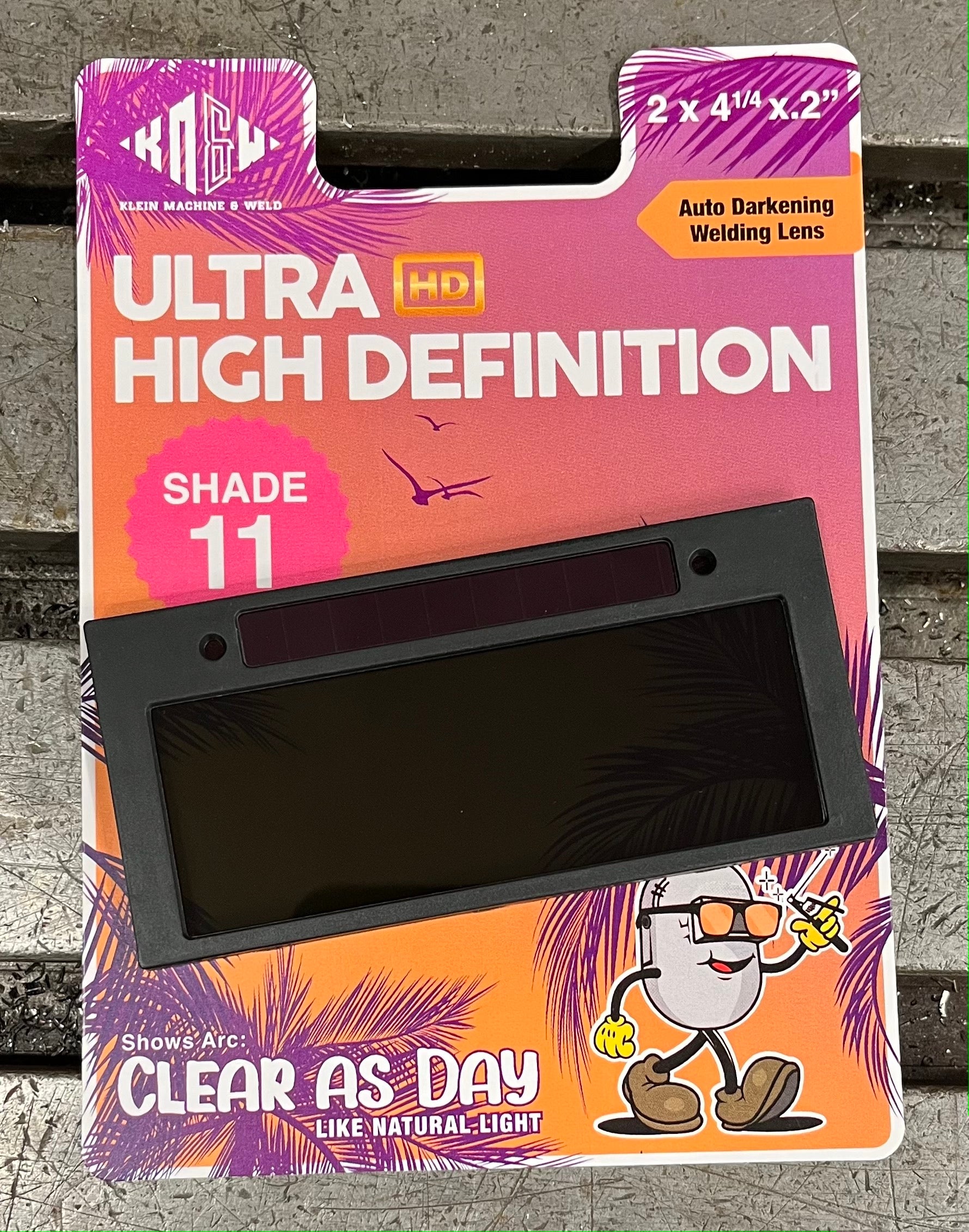 Solar powered auto darkening welding lens. Shows arc in clear natural looking light.